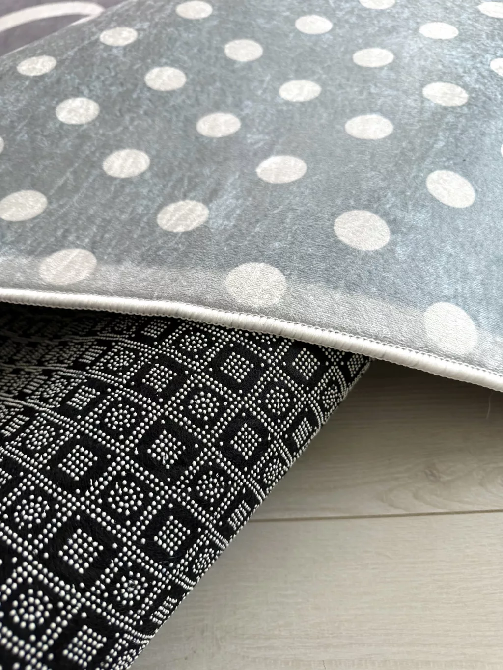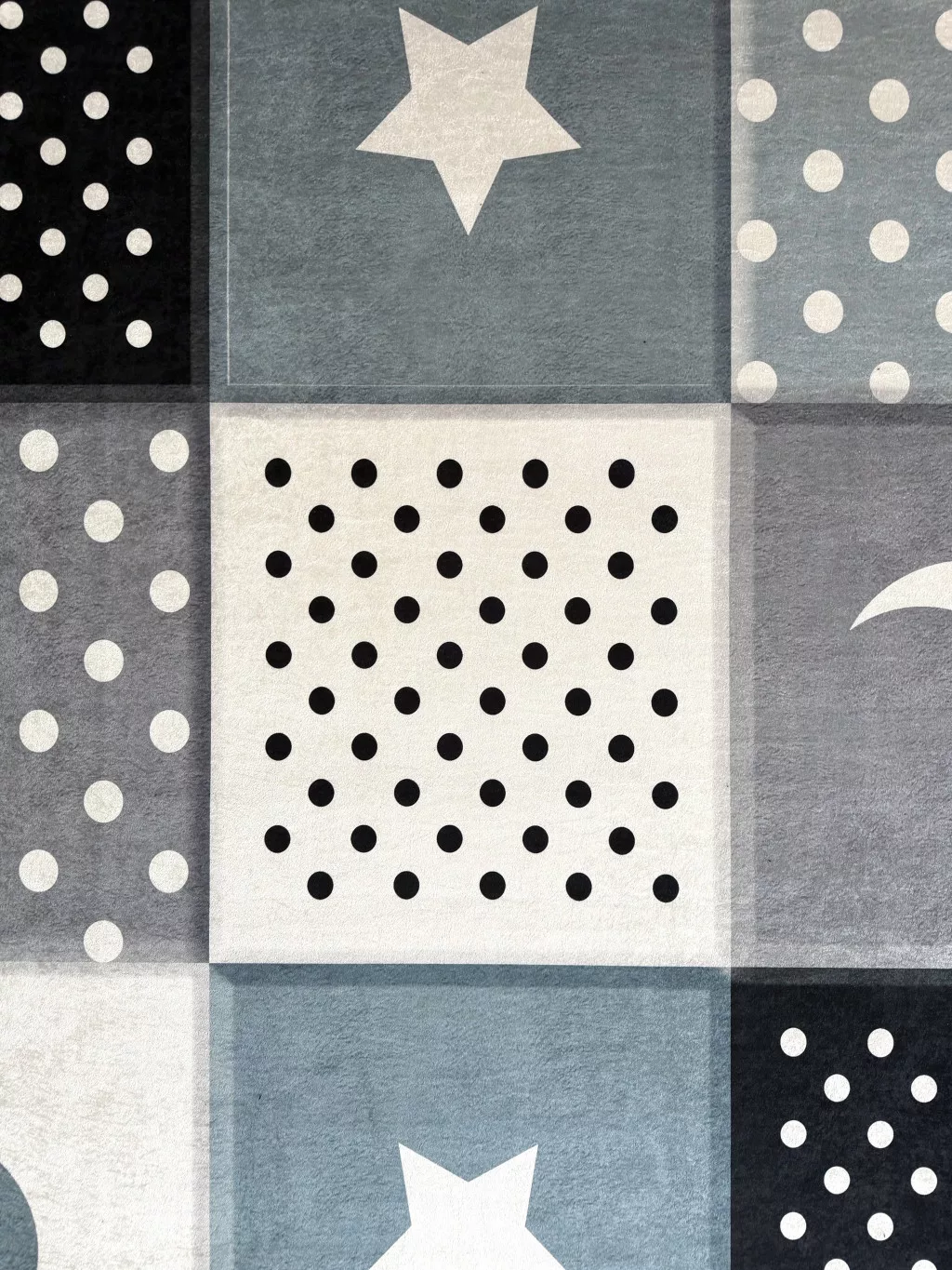 A szőnyeg 100% poliészter anyagból készült, amely puha, mégis strapabíró felületet biztosít. A kb. 6–7 mm-es szálmagasság ideális választás a mindennapi használatra: kényelmes a gyerekeknek, miközben könnyen tisztán tartható.