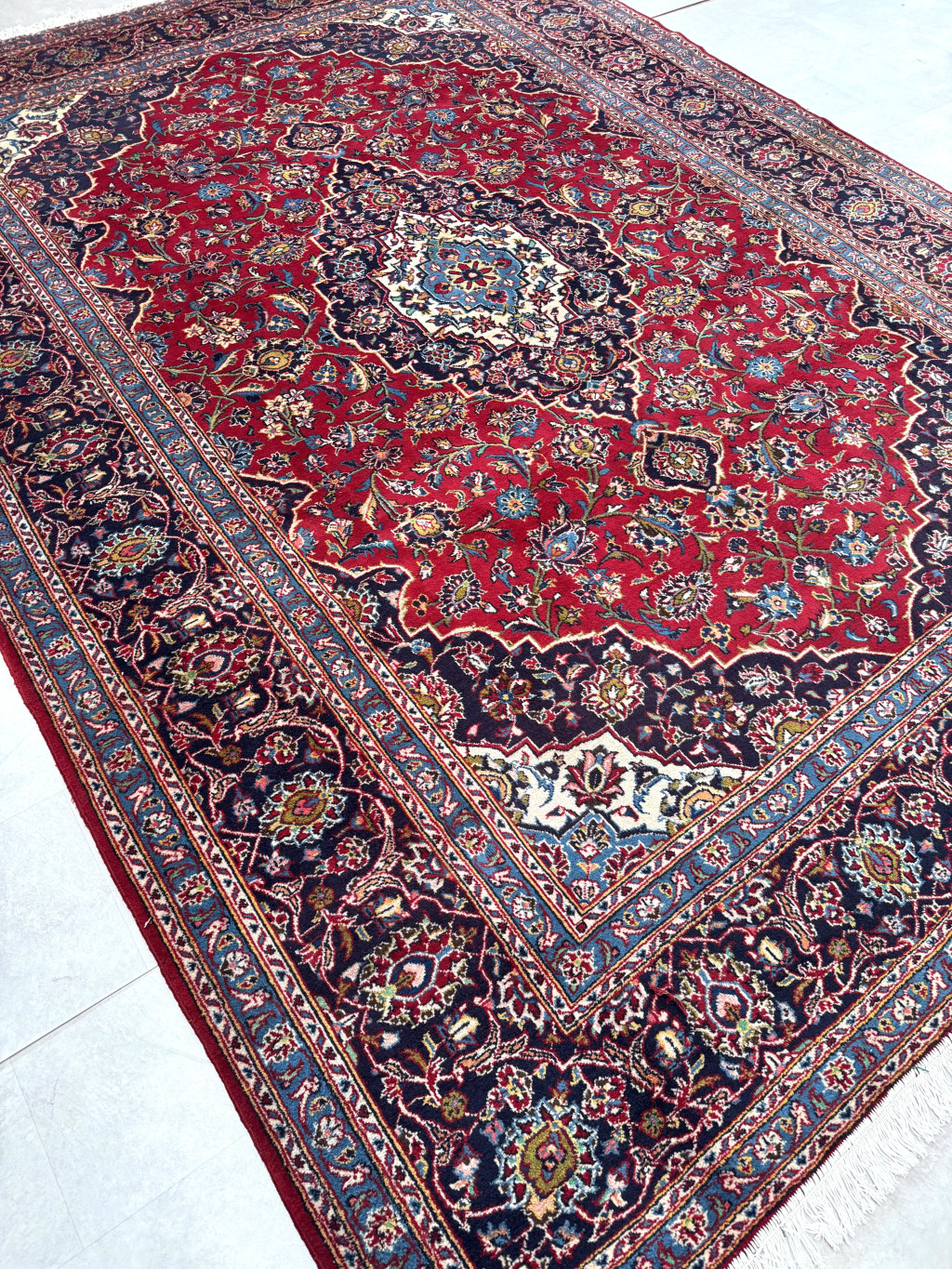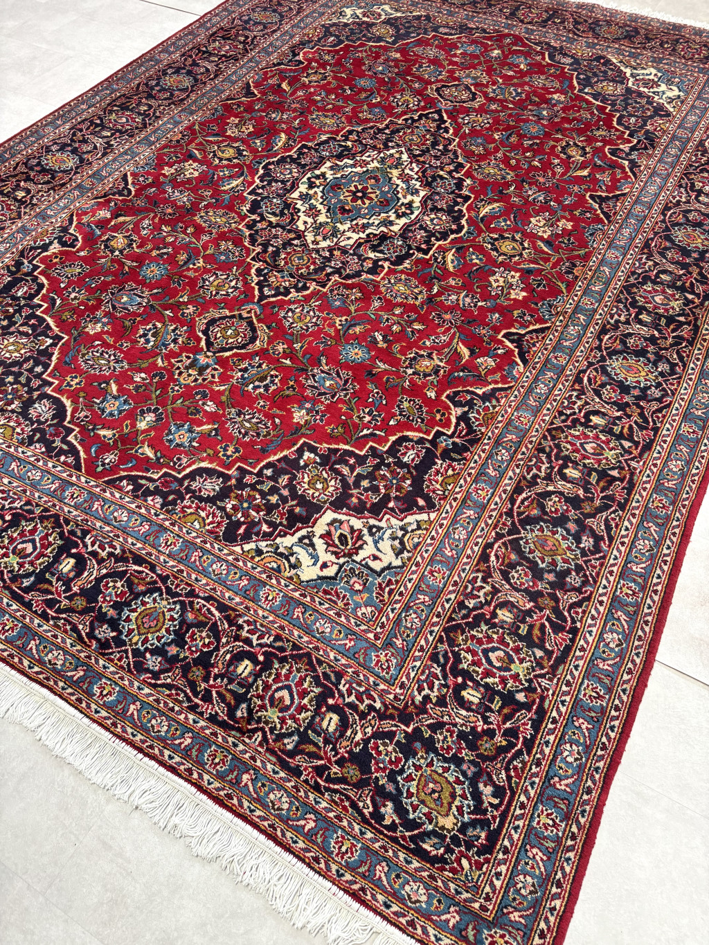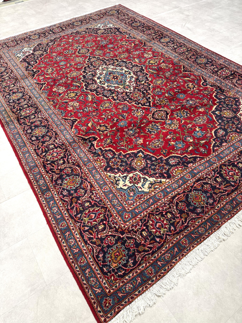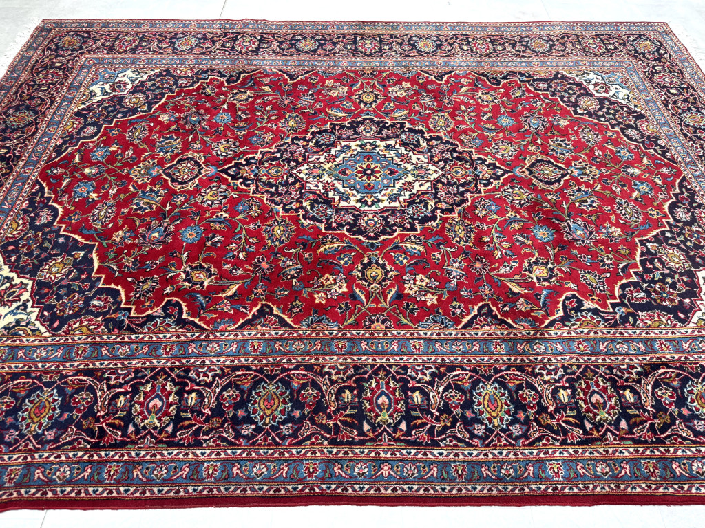 Kézi csomózású perzsa Kashan Bordós Kékes szőnyeg 355x260cm