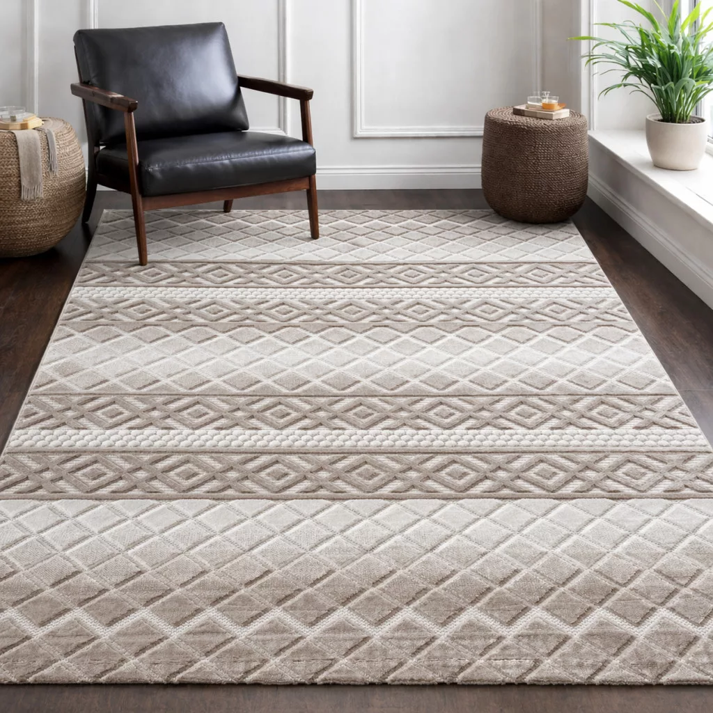 Bohemia modern bézs szőnyeg dombornyomott geometrikus és sávos mintával, nappali környezetben.