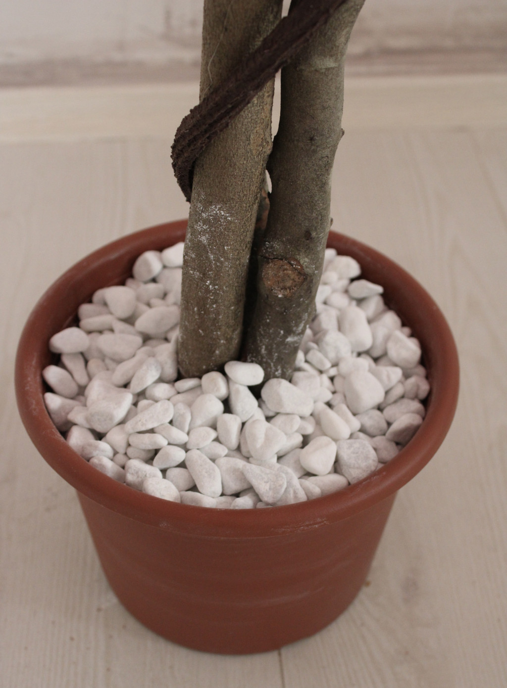 A műnövényt váza nélkül kínáljuk, így Ön szabadon választhat hozzá a stílusához legjobban illő kaspót vagy vázát. Az alja nincs begipszelve, ezért egyszerűen elhelyezhető fehér kavics vagy dekorációs kő segítségével, így természetes és esztétikus hatást kelt otthonában vagy irodájában.