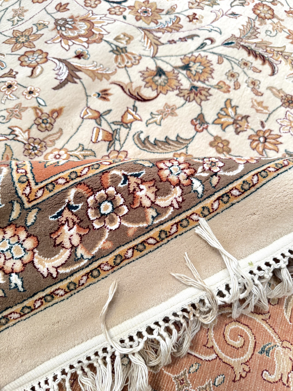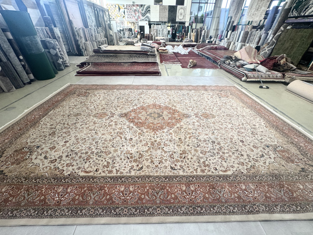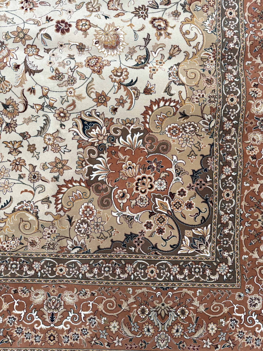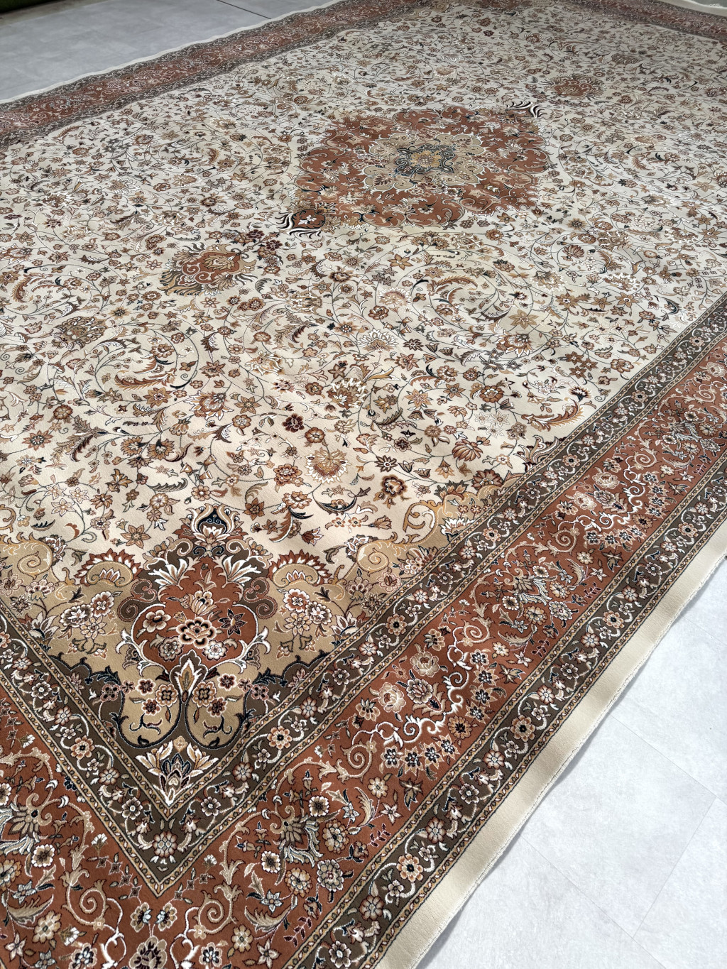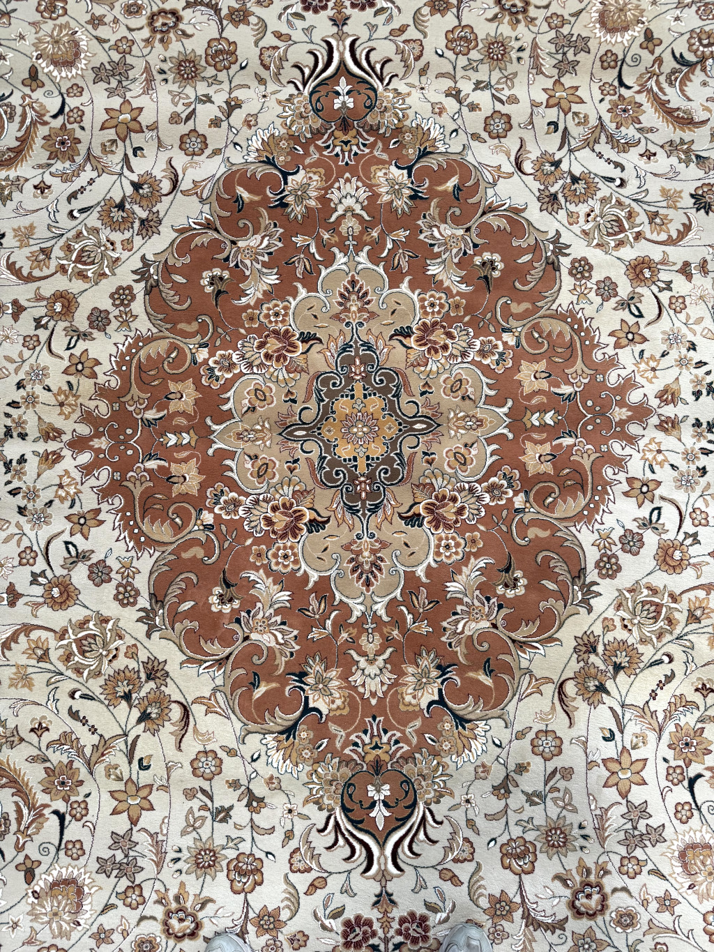 A Tabriz mintavilágra jellemző gazdag, sűrű ornamentika, krem alapszínnel és finoman kidolgozott, világos részletekkel uralkodó jelenlétet ad a térnek.